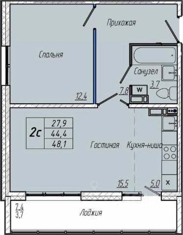 Лоджия 7,4 м2 на две комнаты, застеклена, на полу линолеум.