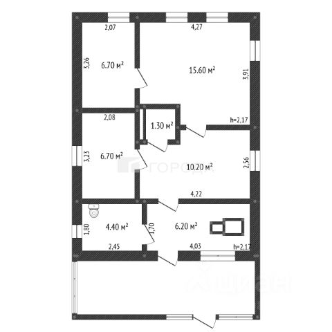 В доме два входа: центральный и на задний двор, три спальни (на 1-ом этаже две спальни (10,4 кв.м. и 18,7 кв.м), на 2-ом этаже (12 кв.м)), зал (18,6 кв.м), просторная кухня (11 кв.м) и коридоры (18,6 кв.м), туалетная комната (3,8 кв.м). Есть кладовая и подполье для хранения солений.