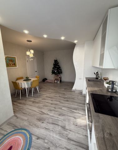 Площадь кухни-столовой (18.3кв.м.)увеличена за счет присоединения лоджии с теплым полом. Оборудована кухонным гарнитуром производства Италия, все лицевые панели из натурального дерева со встроенной бытовой техникой, установлен кондиционер. Кухня наверняка станет любимым местом сбора для семейных посиделок, приготовления вкусных блюд и приёма гостей.
