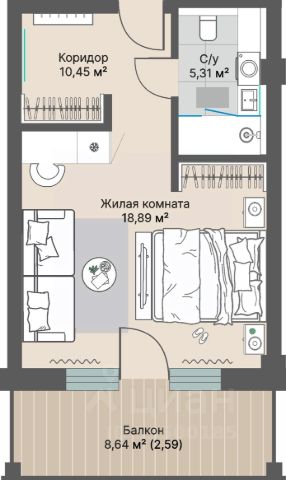Продаются 1-комнатные апартаменты в строящемся доме (Блок 3 (Весенняя, 1)), срок сдачи: IV-кв. 2030, общей площадью 37.55 кв.м., на 6 этаже.