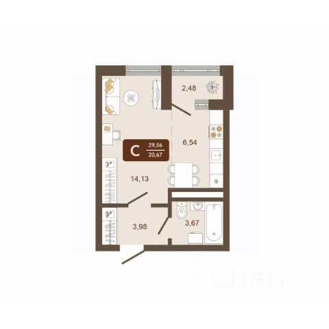 - Общая площадь: 54,5 кв. м.