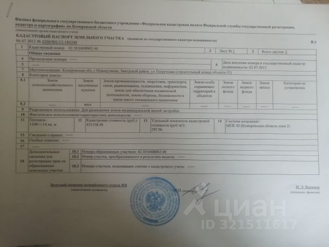 К продаже предлагается земельный участок общей площадью 1 347 кв.м (13,5 сот), кадастровый номер: 42:30:0606001:271, разрешенное использование: для индивидуального жилищного строительства, частная собственность, категория земель: земли населенных пунктов. Земельный участок расположен по адресу: Кемеровская область - Кузбасс, г. Новокузнецк, Новоильинский р-н, пр-д Талдинский, земельный участок 5. Участок прямоугольной формы с ровным рельефом расположен в районе с активно развивающейся застройкой индивидуальных жилых объектов. Локация участка обеспечена необходимой инфраструктурой, в непосредственной близости находятся жилые многоквартирные комплексы, остановки общественного транспорта, торговые объекты, включая продуктовые магазины, а также социальные учреждения, что способствует созданию комфортных условий для проживания и ведения хозяйственной деятельности. Право собственности на данный земельный участок оформлено в соответствии с действующим законодательством, что исключает наличие юридических обременений и гарантирует юридическую чистоту сделки.