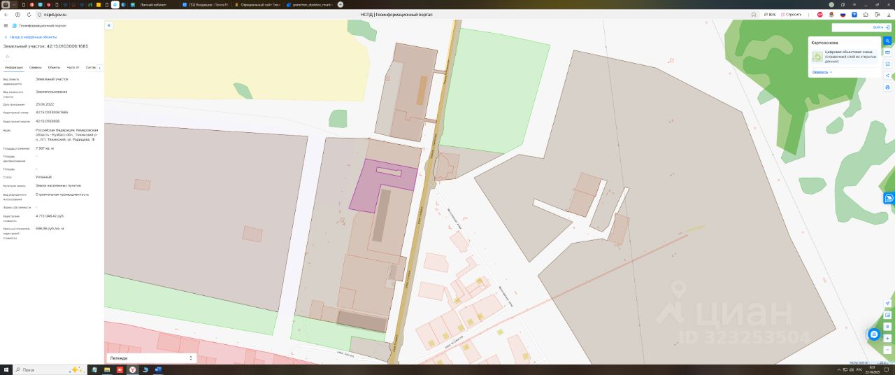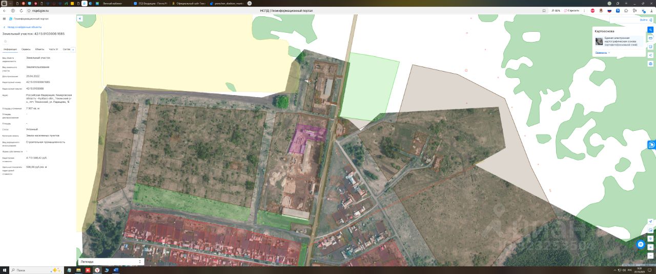 Земельный участок площадью 7907 кв.м., кадастровый номер 42:15:0103006:1685, категория земель - земли населенных пунктов, вид разрешенного использования строительная промышленность, расположен по адресу: Российская Федерация, Кемеровская область-Кузбасс, Тяжинский район, пгт.Тяжинский, ул.Радищева, 1Е. Государственная собственность на земельный участок не разграничена. Обременений нет.