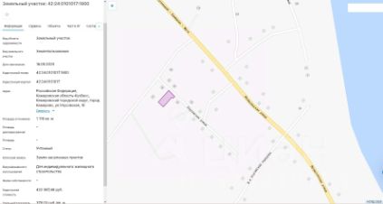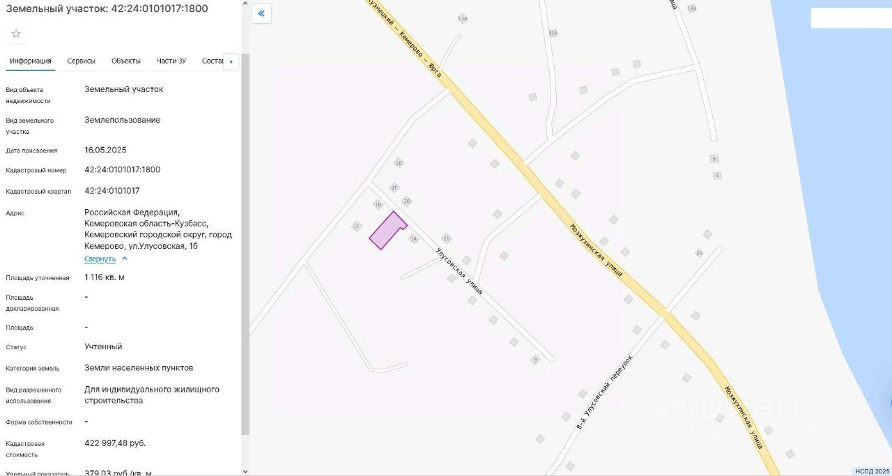 Земельный участок, пл.1116 кв.м, кадастровый 42:24:0101017:1800, разрешенное использование: для индивидуального жилищного строительства, по адресу: г.Кемерово, ул.Улусовская, 1б. Срок аренды 20 лет