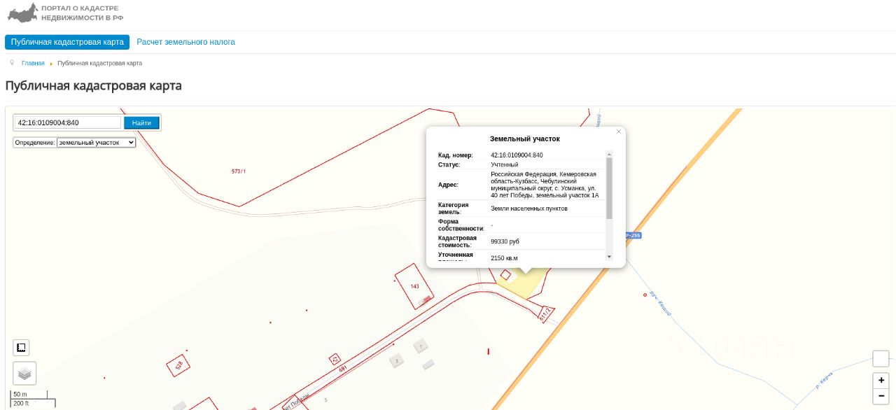 Земельный участок площадью 2 150 кв.м., кадастровый номер: 42:16:0109004:840, категория: земли населенных пунктов, вид разрешенного использования: автомобильный транспорт, расположенный по адресу: Российская Федерация, Кемеровская область-Кузбасс, Чебулинский муниципальный округ, с. Усманка, ул. 40 лет Победы, земельный участок 1А
