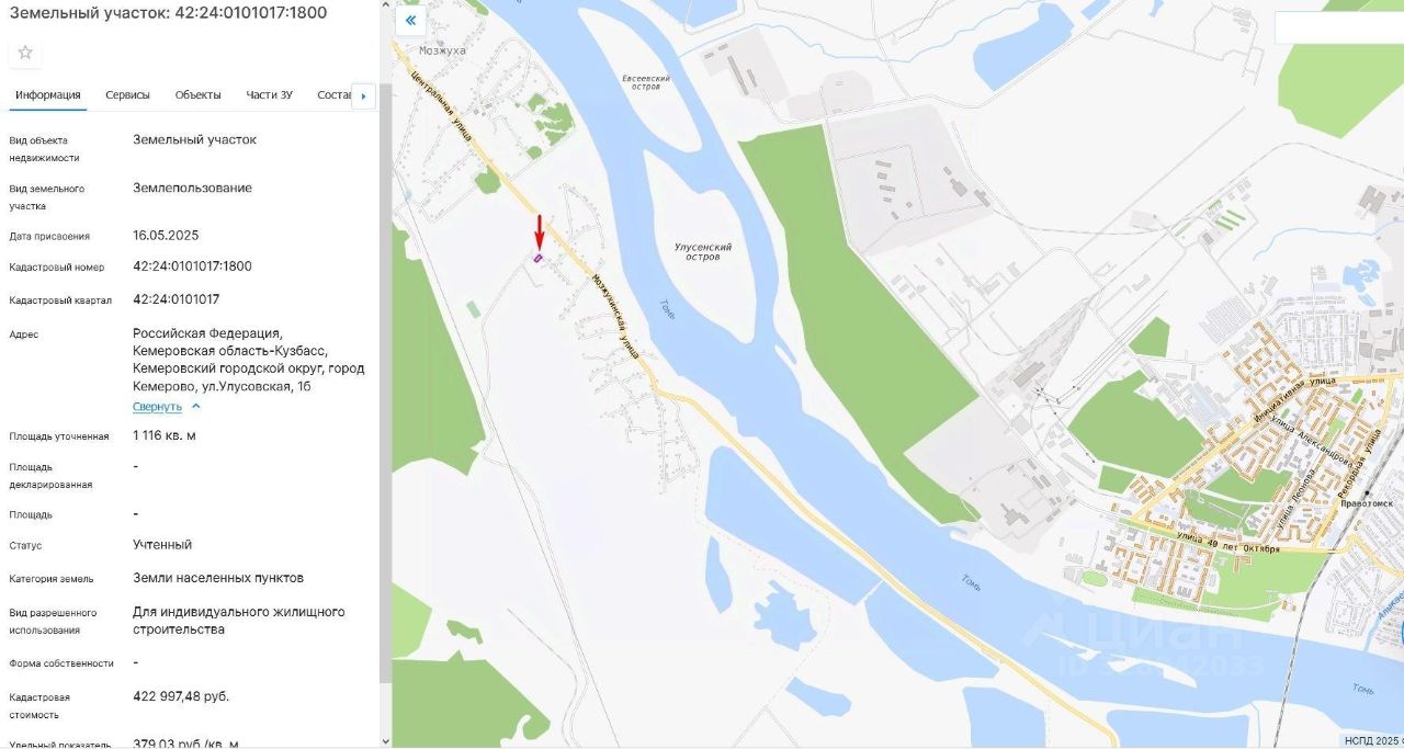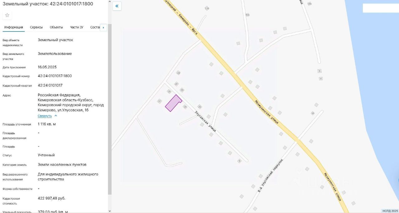 Земельный участок, пл.1116 кв.м, кадастровый 42:24:0101017:1800, разрешенное использование: для индивидуального жилищного строительства, по адресу: г.Кемерово, ул.Улусовская, 1б. Срок аренды 20 лет