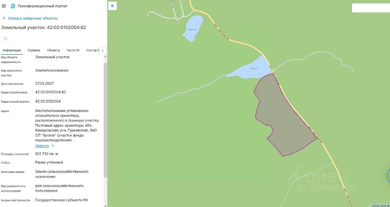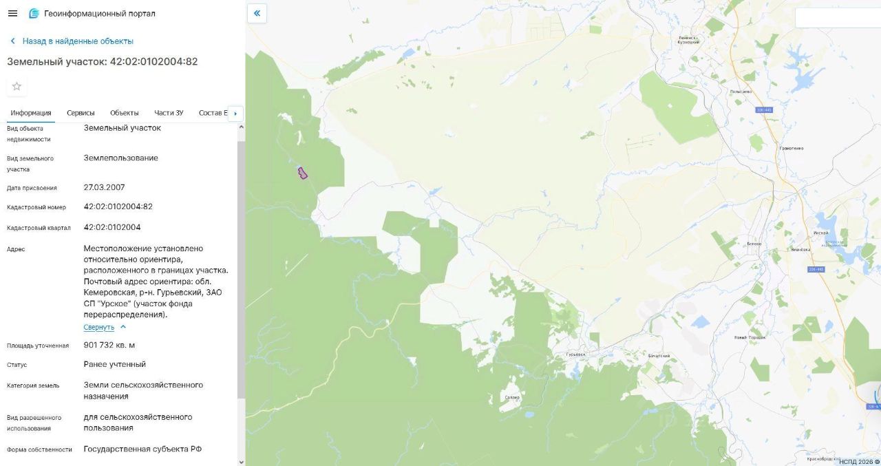 Земельный участок, пл.901732 кв.м, кадастровый 42:02:0102004:82, разрешенное использование: для сельскохозяйственного пользования, по адресу: обл. Кемеровская, р-н Гурьевский, ЗАО СП "Урское". Срок аренды 5 лет