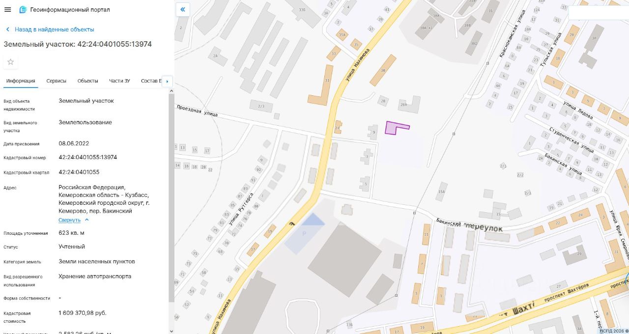 Земельный участок, пл.623 кв.м, кадастровый 42:24:0401055:13974, разрешенное использование: хранение автотранспорта, по адресу: Кемеровская область, г.Кемерово, пер.Бакинский. Срок аренды 58 месяцев