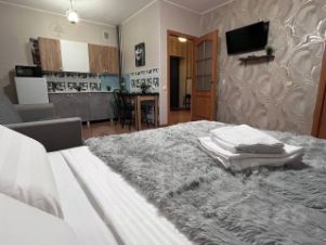 1 комнатная квартира. Есть вся необходимая мебель, посуда, бытовая техника, Wi-Fi. Двуспальная кровать (140 см ширина), и двуспальный диван. Постельные принадлежности, полотенца.