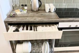 КУХОННАЯ ЗОНА: Кухонный гарнитур, холодильник, керамическая плита, электрический чайник, полный набор посуды и столовых приборов, обеденный стол, средства для мытья посуды.