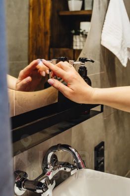 Ванная комната с большой душевой кабинкой и всеми средствами гигиены.