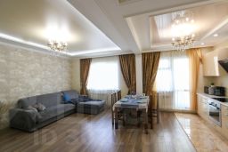 Квартира "Жасмин" предлагает комфортабельную гостиную с удобными диванами и телевизором, где вы сможете расслабиться после насыщенного дня. Кухня оборудована всей необходимой современной бытовой техникой, включая плиту, холодильник и микроволновую печь. Здесь также имеется обеденный стол, где вы сможете насладиться приятными семейными ужинами.