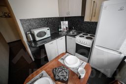 Квартира для 4 гостей. Спальные места: диван и двуспальная кровать. Оборудована холодильником, ТV, СВЧ, стиральной машинкой, утюгом, феном. Есть WI-FI. Каждому клиенту предоставляется комплект постельного белья, полотенца, одноразовые тапочки, коврик в ванную. Кухня оборудована всем необходимым для приготовления вкусных обедов.