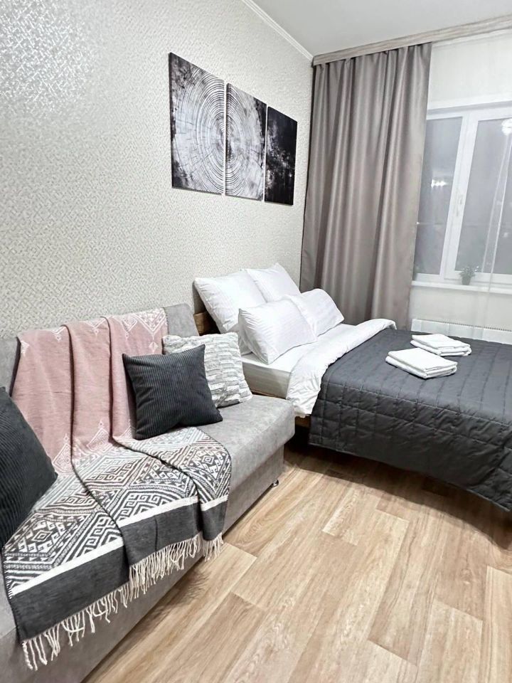 1 комнатная квартира. Есть вся необходимая мебель, посуда, бытовая техника, Wi-Fi. Двуспальная кровать (140 см ширина),и диван. Постельные принадлежности, полотенца.