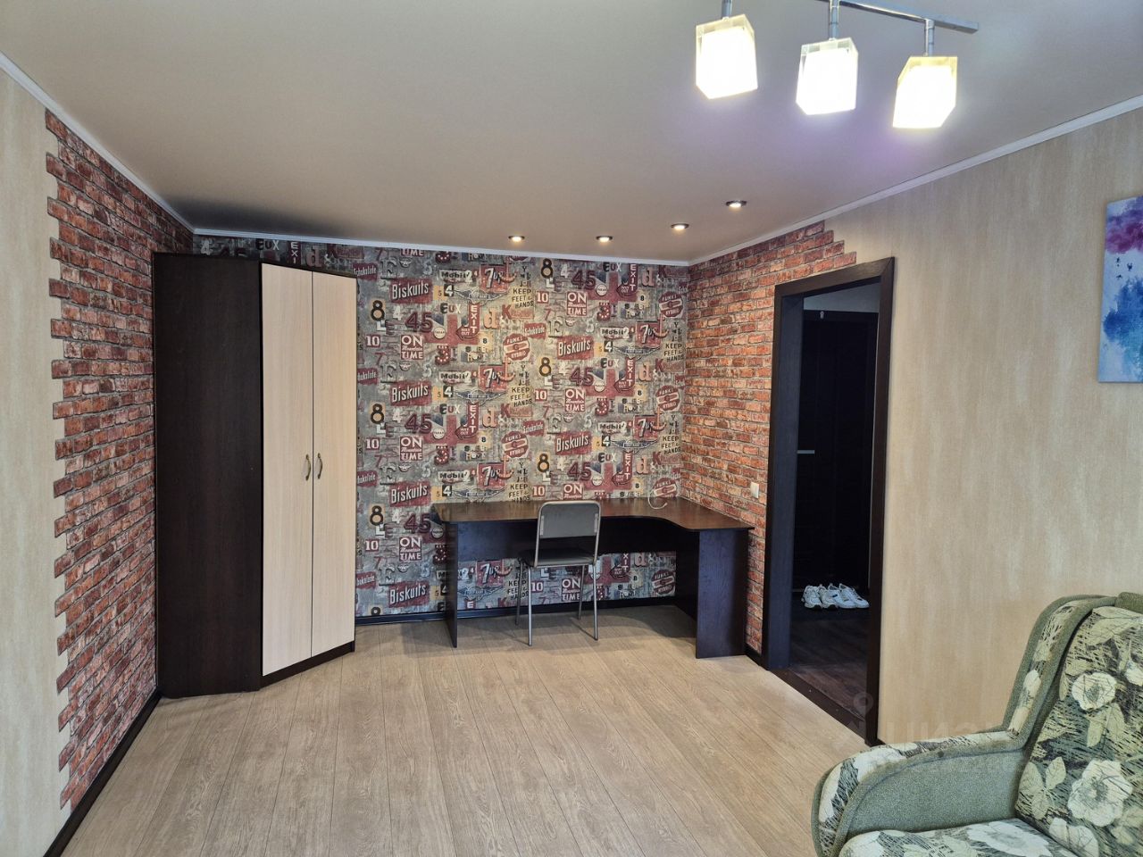 Мебель: диван, тумба, стол раскладной, стол компьютерный со стулом, шкаф, кухонный гарнитур и обеденный стол, обувница и вешалка в коридоре.