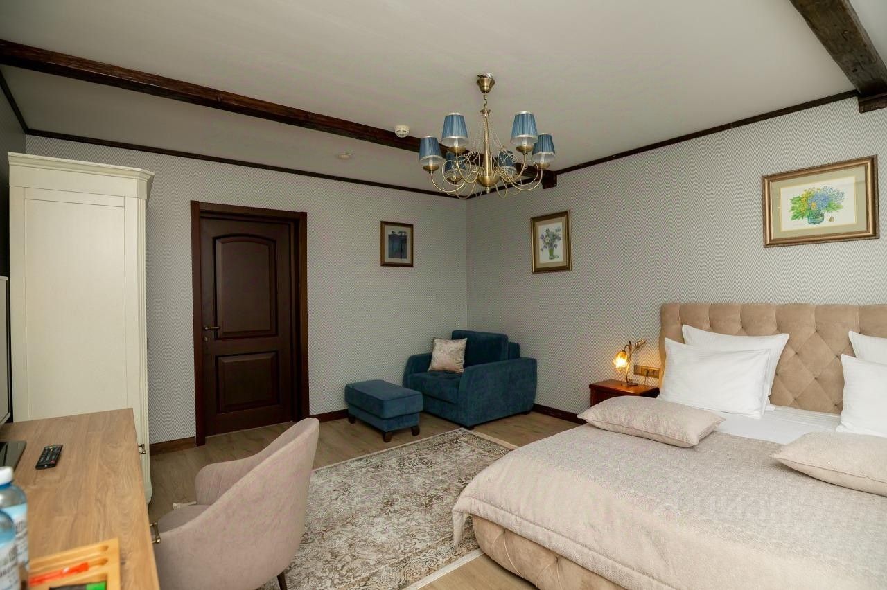 Двухместный номер с двуспальной кроватью, дополнительно есть кресло-кровать. Номер оснащен местом для хранения одежды, телевизором, электрическим чайником, ванной комнатой, предоставляются туалетно-косметические принадлежности.