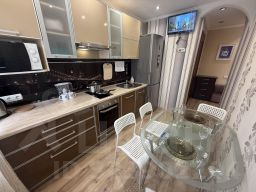 • Наши квартиры оборудованы всем необходимым. На кухне есть всё необходимое для приготовления пищи, включая микроволновую печь, электрочайник, холодильник и посуду.