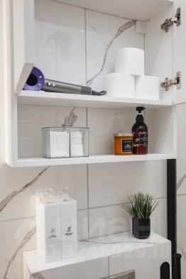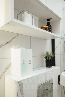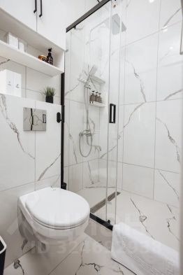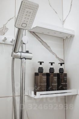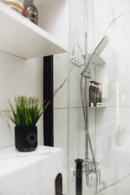 Ванная комната с большой душевой кабинкой и всеми средствами гигиены.
