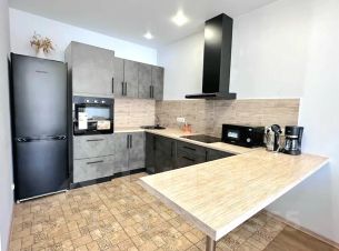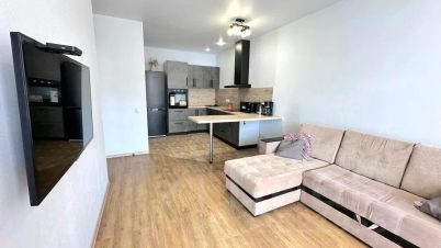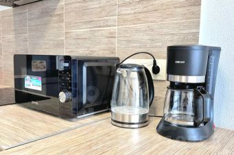 - Полностью оборудованная техникой и посудой современная кухня: холодильник, чайник, плита, микроволновка, кофеварка. Чай и кофе на кухне также имеются)