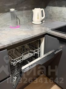 Кухня-студия: индукционная панель и духовка. Вытяжка, холодильник и посудомоечная машина. Фильтр для чистой воды. Полный набор посуды и столовых приборов. Обеденный стол на троих