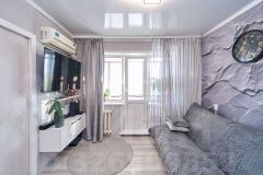 Косметический ремонт: стены выровнены и оклеены обоями в спокойных оттенках, в комнатах-ламинат, кухня и коридор- линолеумом, а в ванной комнате на полу и стенах выложен кафель, окна пластиковые, балкон застеклен, установлены алюминиевые радиаторы.
