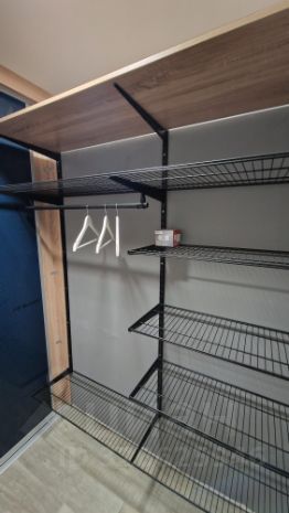 Есть гардеробная с удобными полками для хранения вещей.
