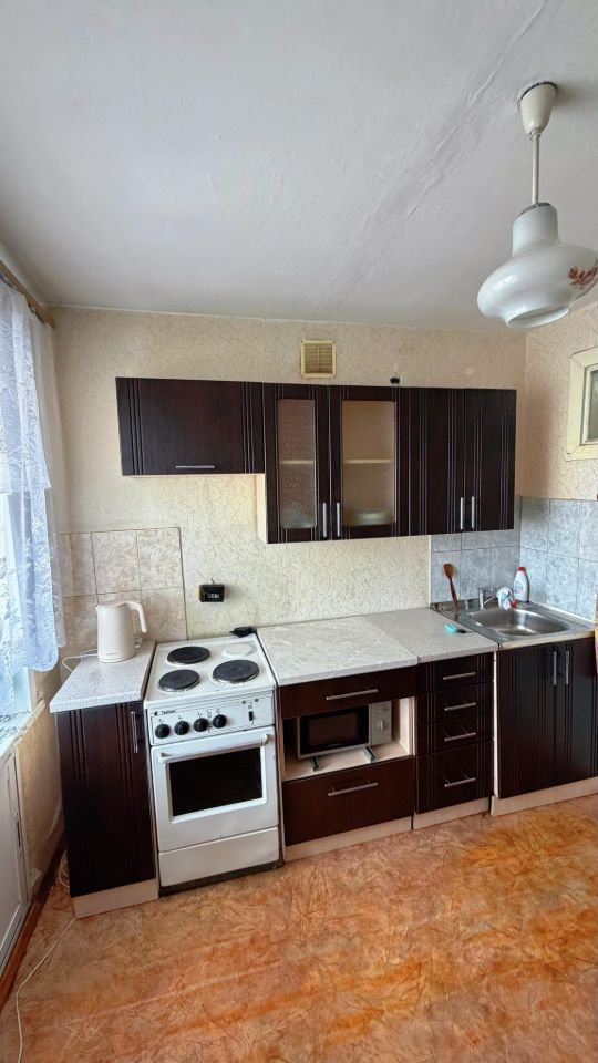 В квартире скромный ремонт, но есть все необходимое для комфортного проживания - кухонный гарнитур, холодильник, чайник, электроплита, стиральная машинка. Есть большая лоджия с видом на площадь СК Снежинка.