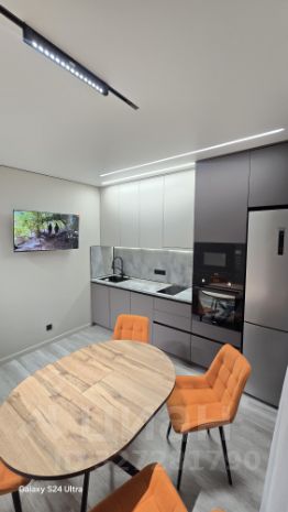 • В Кухне-гостиной: Современный Кухонный гарнитур, со встроенной техникой Варочная поверхность, Духовой шкаф и встроенная микроволновая печь, Вытяжка, Холодильник, Чайник. Телевизор плазма на кронштейне.