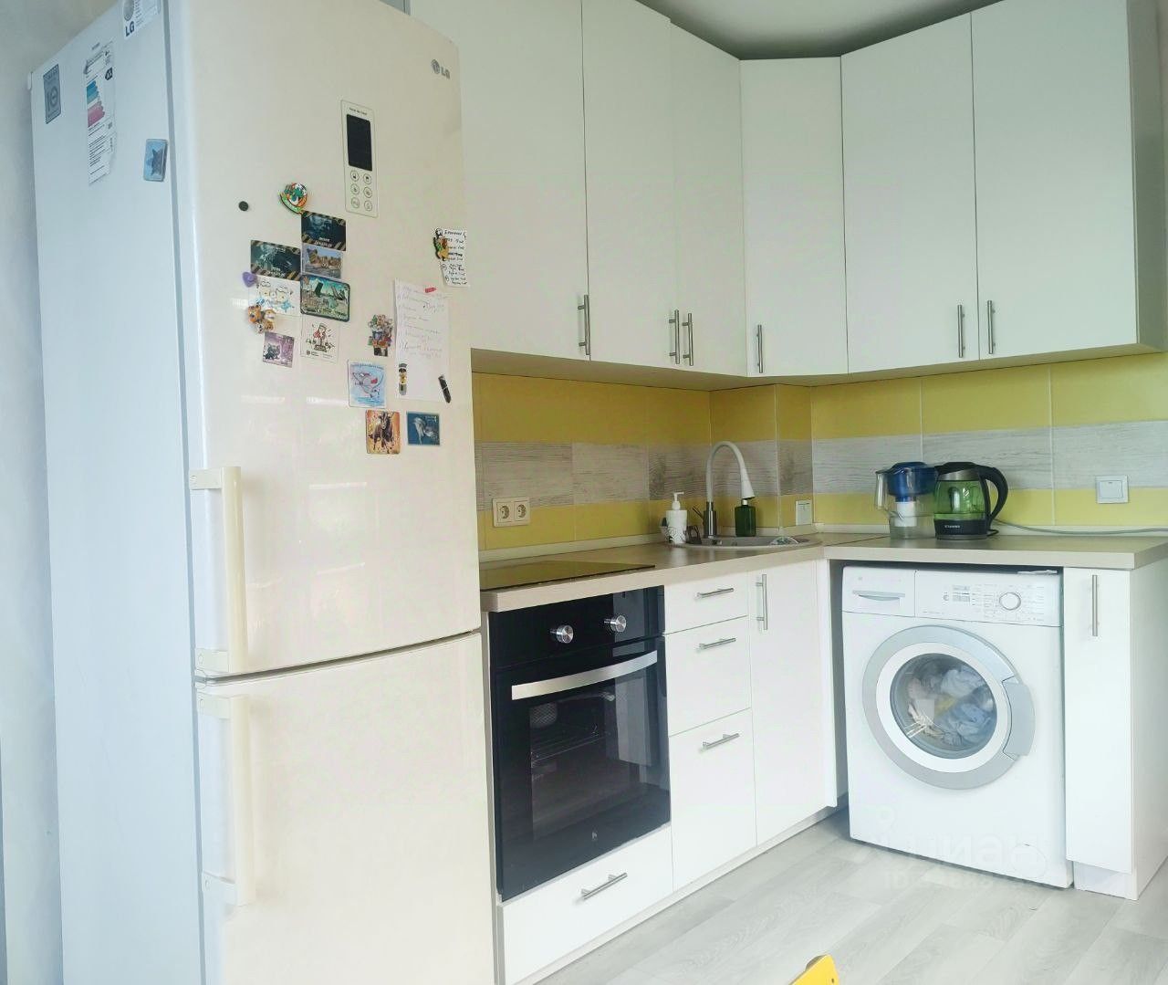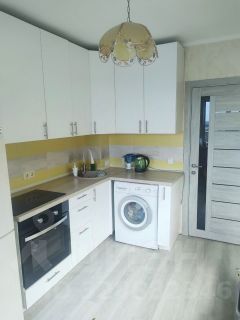На кухне - новый кух.гарнитур, эл. плита и духовой шкаф, большой холодильник, стиральная машина.