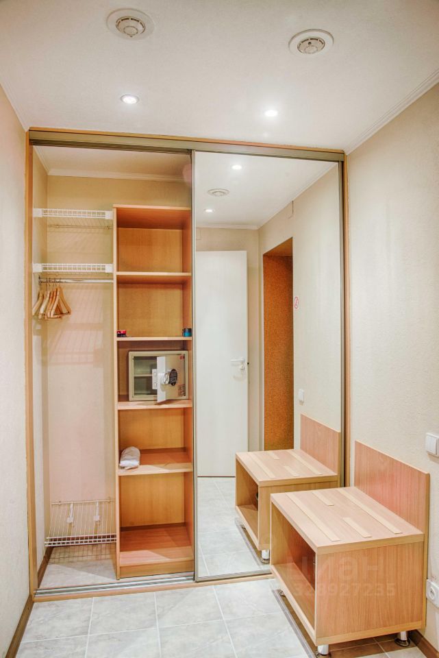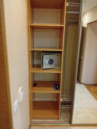 - Шкаф-купе с полками и плечиками для одежды, одежная щетка, губка и ложка для обуви, пакет для грязного белья, сейф.