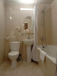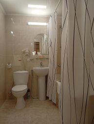 - Большая ванная комната с полным набором сантехники (раковина, унитаз, гигиенический душ, ванна или душевая кабина), фен, набор полотенец, коврик для ног, набор средств индивидуальной гигиены (мыло, шампунь, гель для душа, шапочка для душа, зубной набор).