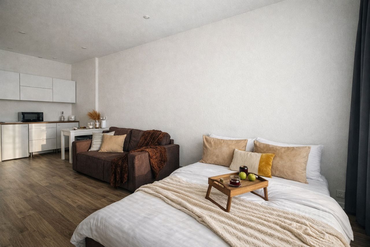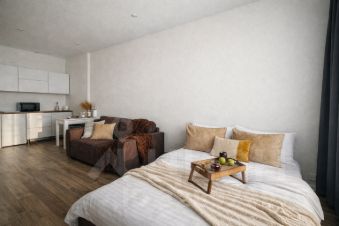 Откройте для себя нашу уютную студию ШОКОЛАД с шикарным видом из панорамного окна. Наслаждайтесь тишиной и зеленью, безопасностью закрытой территории и удобством парковки.