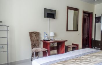В номере: Двуспальная кровать с ортопедическим матрацем, ЖК телевизор, Письменный стол, Гардероб, Душ.