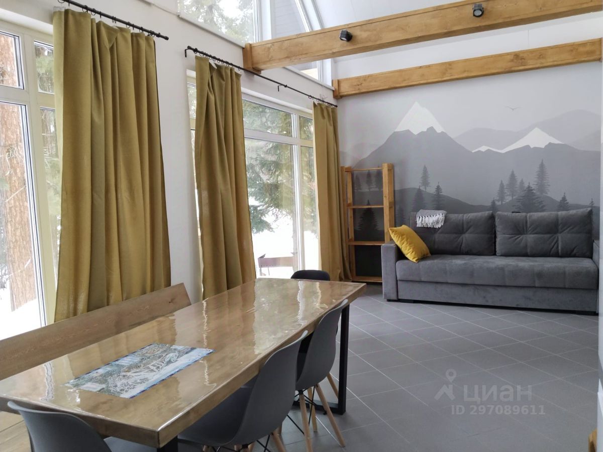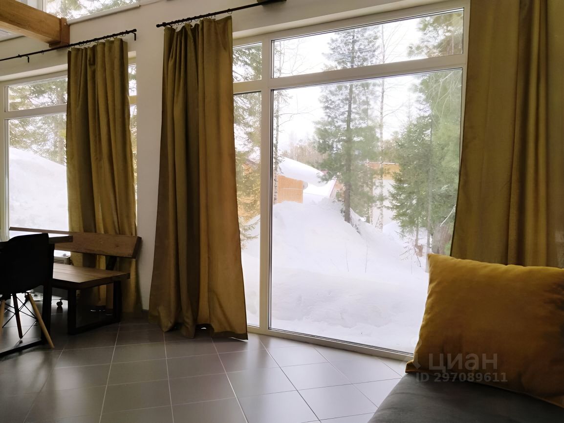 - гостиная с кухонной зоной и диваном, с высотой потолка 6 метров и панорамными окнами в пол с видом на пихты и кедры.