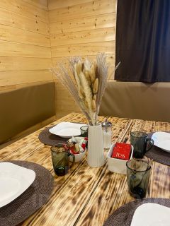 Кухонная и обеденная зона, оборудованная всем необходимым для комфортного отдыха( ТВ,духовая печь, микроволновая печь, холодильник, чайник,посуда и т.д)