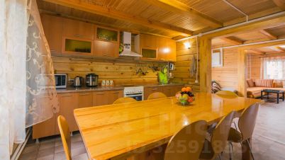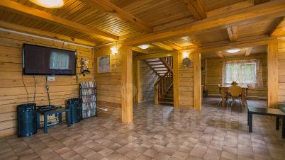 Коттедж (общая площадь 300 м2). На первом этаже расположен большой холл с банкетным столом, совмещенный с полностью оборудованной кухней (холодильник, посудомоечная машина, плита). Для приготовления любимых блюд мангал на улице. Планировка позволяет разместить 4 семьи в отдельных номерах.