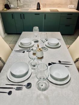 Кухонная и обеденная зона, оборудованная всем необходимым для комфортного отдыха (посудомоечная машина, микроволновая печь, индукционная плита, холодильник, чайник);