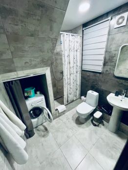 Ванная комната с душевой кабиной (стиральная машина, водонагреватель, средства гигиены, фен)