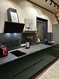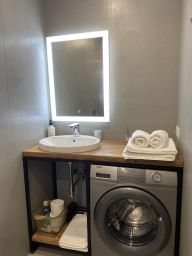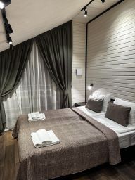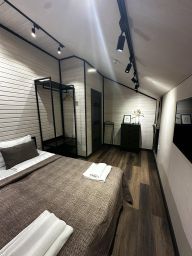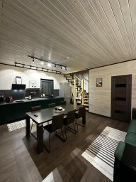 Современный комфортабельный двухэтажный гостевой дом на 6 гостей, построен в стиле барнхаус. Панорамное остекление с видом на лес. Отдельный вход. В доме две раздельные спальни с двухспальными кроватями 160*200. Два санузла с душевыми и стиральной машиной. Косметика для душа и белоснежные полотенца для каждого гостя. На первом этаже расположена гостиная с раскладным диваном и большим телевизором с функцией SmartTV, кухня, оборудованная бытовой техникой и посудой. Сушка для горнолыжных ботинок. Собственная терраса с шезлонгами.