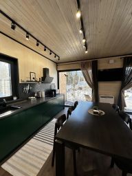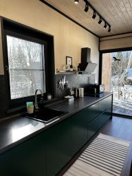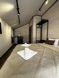 Современный, полностью оборудованный гостевой дом-дуплекс. Один из двух совмещенных домов с отдельным входом и собственной террасой. В двухэтажном барнхаусе: две раздельные спальни с двуспальными кроватями, два санузла с душевыми, стиральная машина. Просторная гостиная с раскладным диваном и SmartTV, полностью оборудованная техникой и посудой кухня-столовая с большим обеденным столом. С собственной террасы открывается панорамный вид на гору Зеленая.