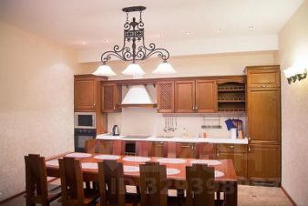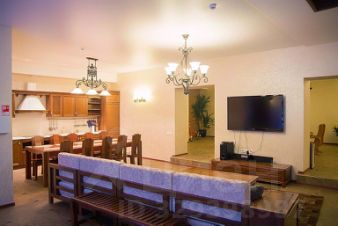 Имеет собственную кухню: мойка, СВЧ печь, холодильник, электроплита, набор посуды), обеденный стол на 10 человек.