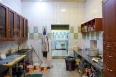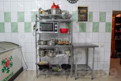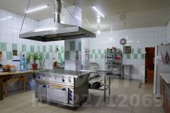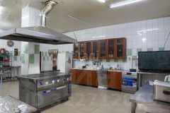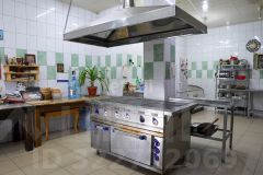 Бар плавно переходит в кухню, оборудованную всем необходимым для поваров и персонала: плита кухонная электрическая ЭП-5, микроволновая печь, фритюр на 7,5 литров, посудомоечная машина на 14 приборов, холодильник, морозильная камера, ларь, 5 железных столов, 1 стеллаж пятисекционный, кухня, длинной 3 метра с металлической мойкой.