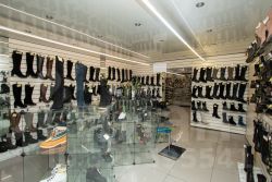 • В торговых залах: плитка на полу, панели на стенах, натяжной потолок с точечным освещением