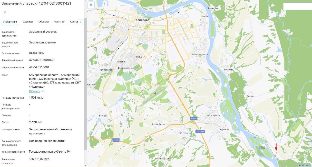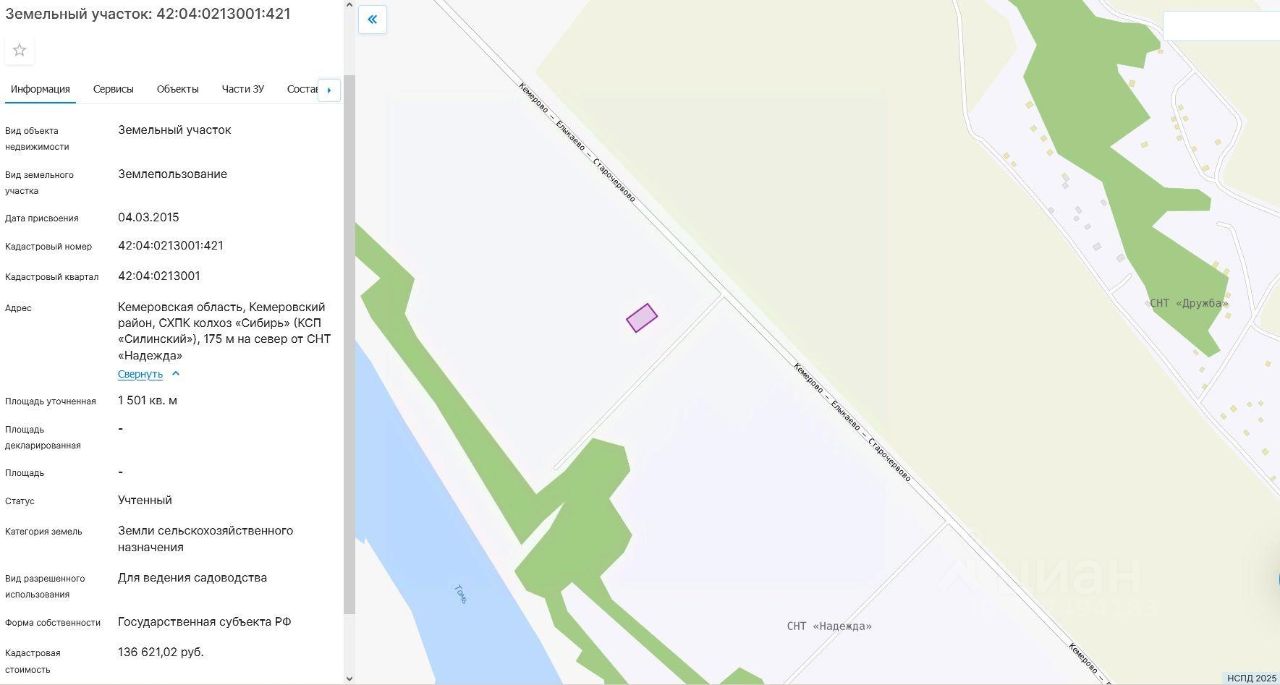 Земельный участок, пл.1501 кв.м, кадастровый 42:04:0213001:421, разрешенное использование: для ведения садоводства, по адресу: Кемеровская область, Кемеровский район, СХПК колхоз "Сибирь" (КСП "Силинский"), 175 м на север от СНТ "Надежда"
