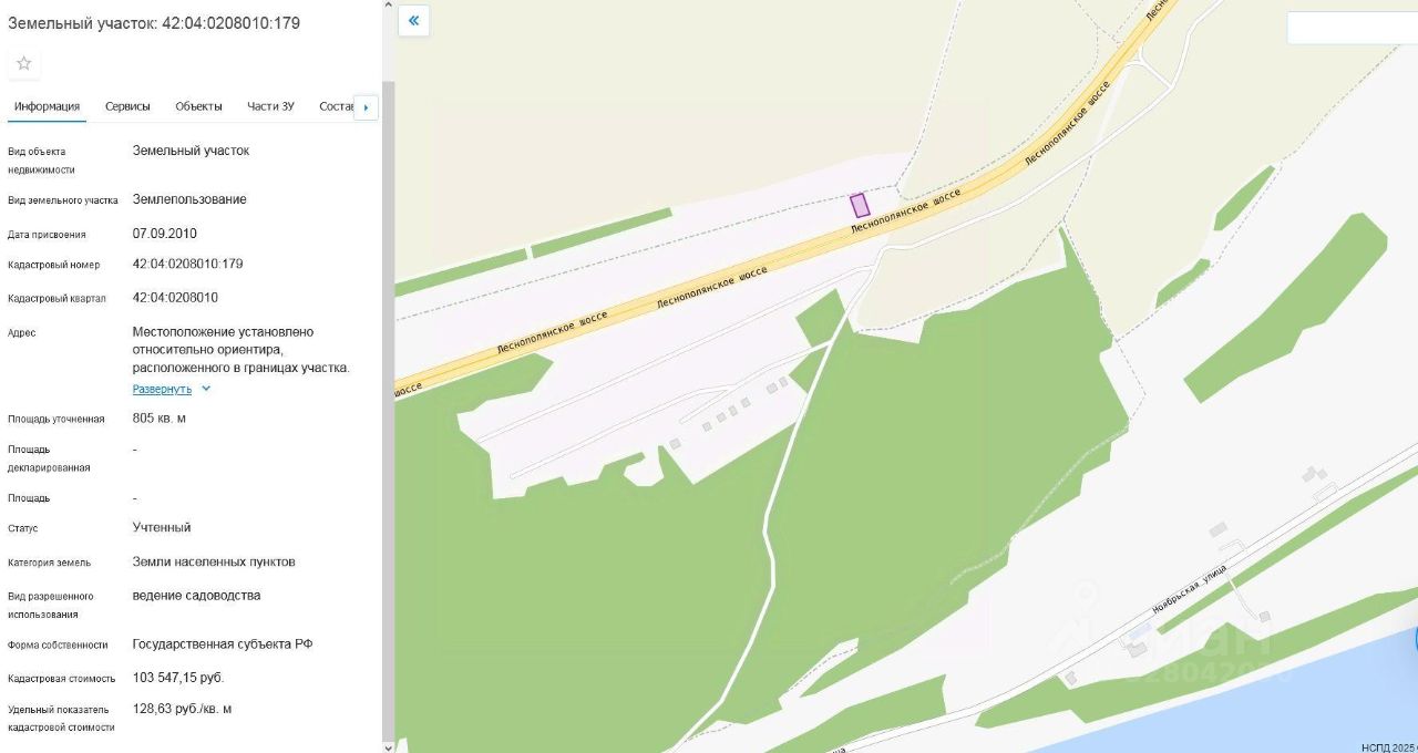 Земельный участок, пл.805 кв.м, кадастровый 42:04:0208010:179, разрешенное использование: для ведения садоводства, по адресу: Кемеровская область, р-н Кемеровский, с.н.т. "Учитель", участок 51