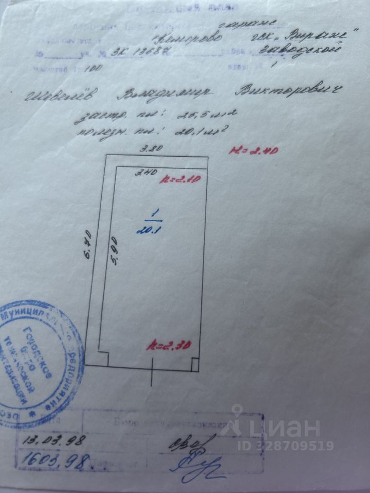 Капитальный гараж полезная площадь 20,1 м2, рядом с домом пер. Мичурина, д.5а.
