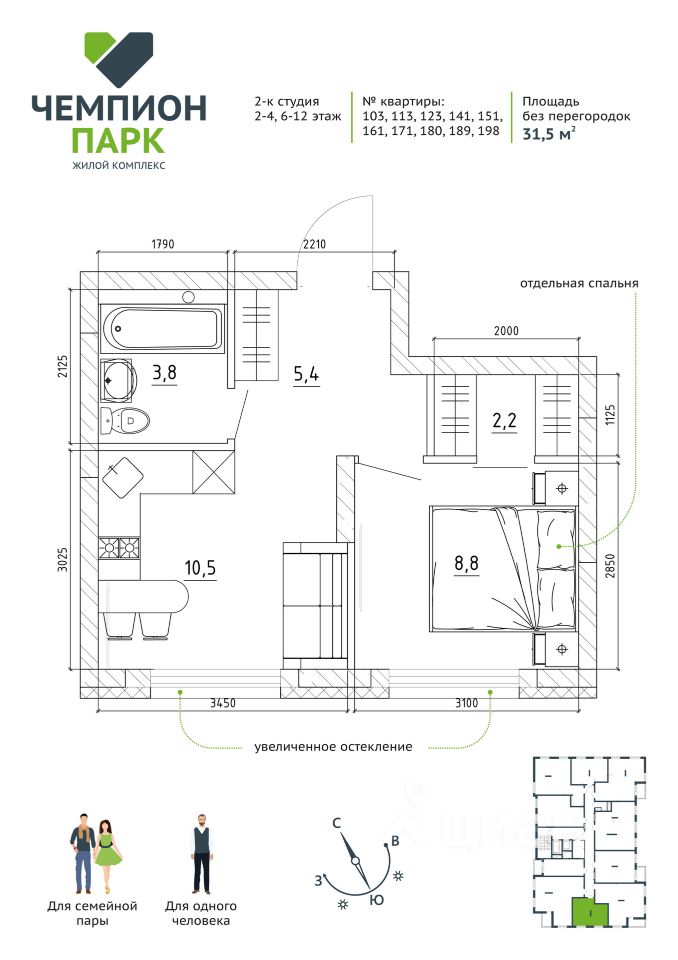 1 комн. квартира 31,5 кв.м., можно сделать евродвушку. Дом 2/2 срок сдачи март 2026 года.