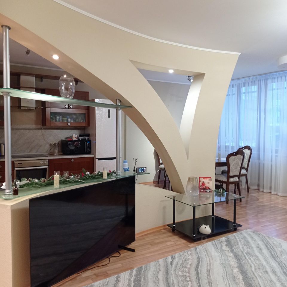 В квартире просторная кухня-гостиная, где можно проводить время с семьей и друзьями. Две спальни, кабинет, один большой санузел, кладовка, большая прихожая. В квартире остаётся вся мебель (диван, кухонный гарнитур, кухонный стол и стулья, две двух спальные кровати, при кроватные тумбы, комод, три встроенных шкафа. Так же остаётся вся техника (холодильник, телевизор, стиральная машинка, микроволновка, кондиционер, обогреватель воды).