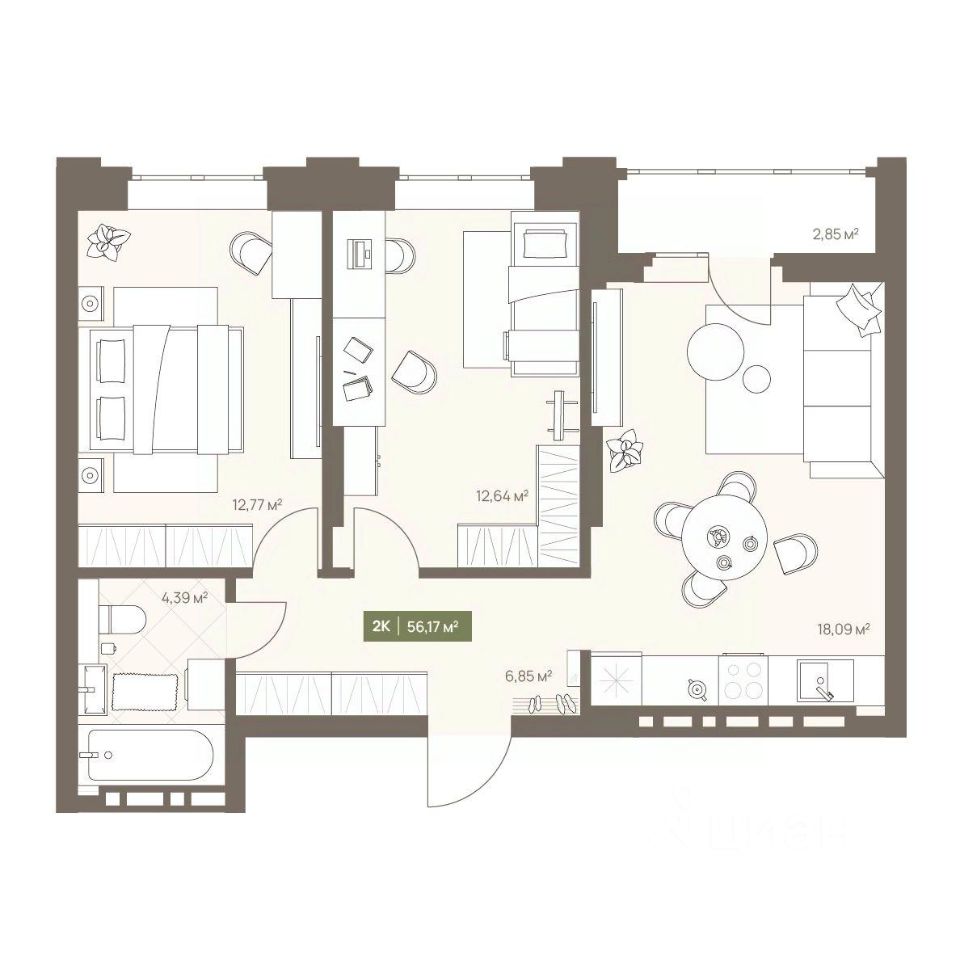 В жилом комплексе NOVA на Московском в продаже квартира N 168 площадью 56.17 кв.м. Кирпич от фасадов до межкомнатных стен, высокие потолки, большие окна и остекленная лоджия. Квартира сдается в отделке white box. 17-этажный дом, с последних этажей которого открываются панорамные виды на город.