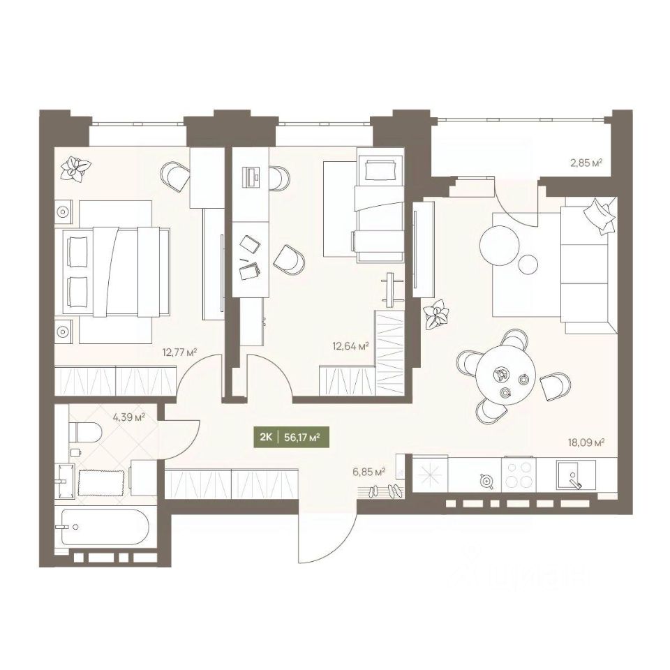 В жилом комплексе NOVA на Московском в продаже квартира N 183 площадью 56.17 кв.м. Кирпич от фасадов до межкомнатных стен, высокие потолки, большие окна и остекленная лоджия. Квартира сдается в отделке white box. 17-этажный дом, с последних этажей которого открываются панорамные виды на город.